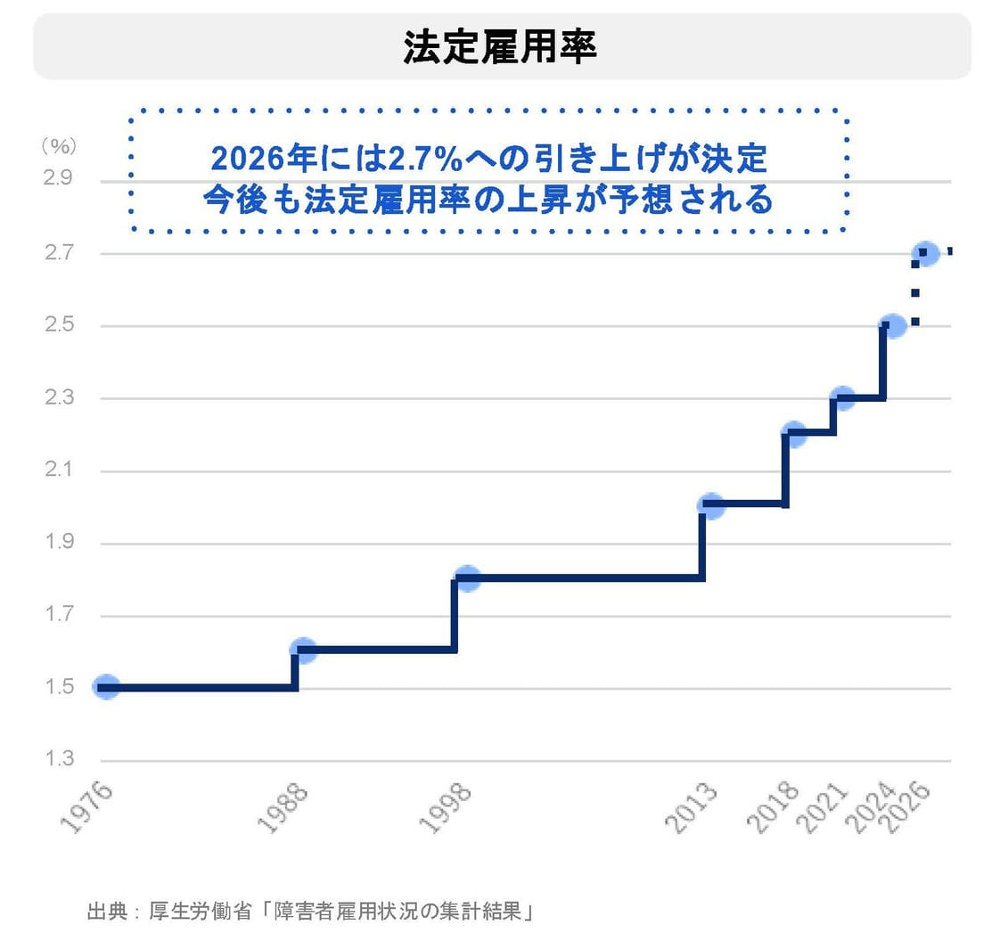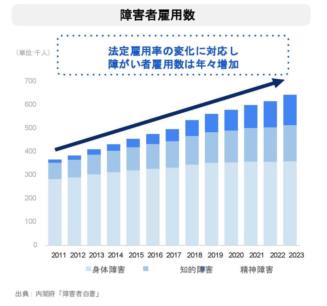 内閣府による調査では、2006年から2018年の12年間で障がい者数が655.9万人から936.6万人と約300万人近く増加しており、日本人の全人口の約8%が障害を抱えている。法定雇用率も上昇傾向にあり、企業の障がい者雇用も年々増加している。